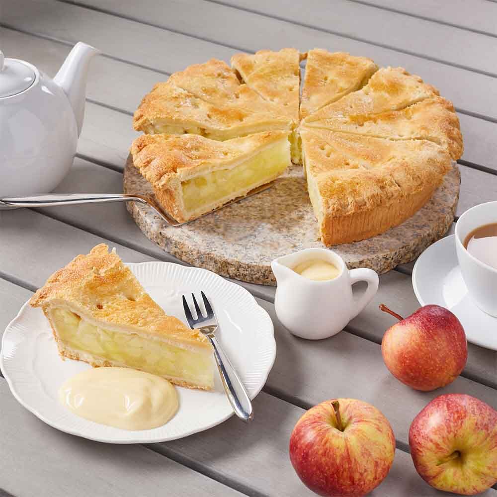 Crisp sweet Pastry layered with juicy Bramley Apple Slices and finished with a Granulated Sugar Glaze