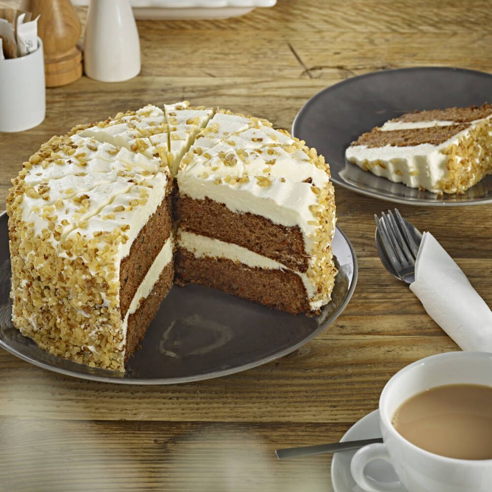 A traditional rich, moist carrot cake containing crushed pineapple and walnuts, with a hint of spice. Coated with a rich vanilla flavoured cream cheese frosting. Side decorated with crunchy walnut pieces and finished off with a scattering of walnut pieces on top. Pre-cut into 16 portions.