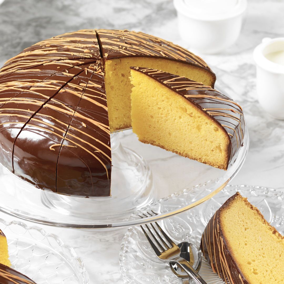 An orange-soaked sponge, filled with a gooey orange jelly and coated in a shiny dark Belgian chocolate ganache,
