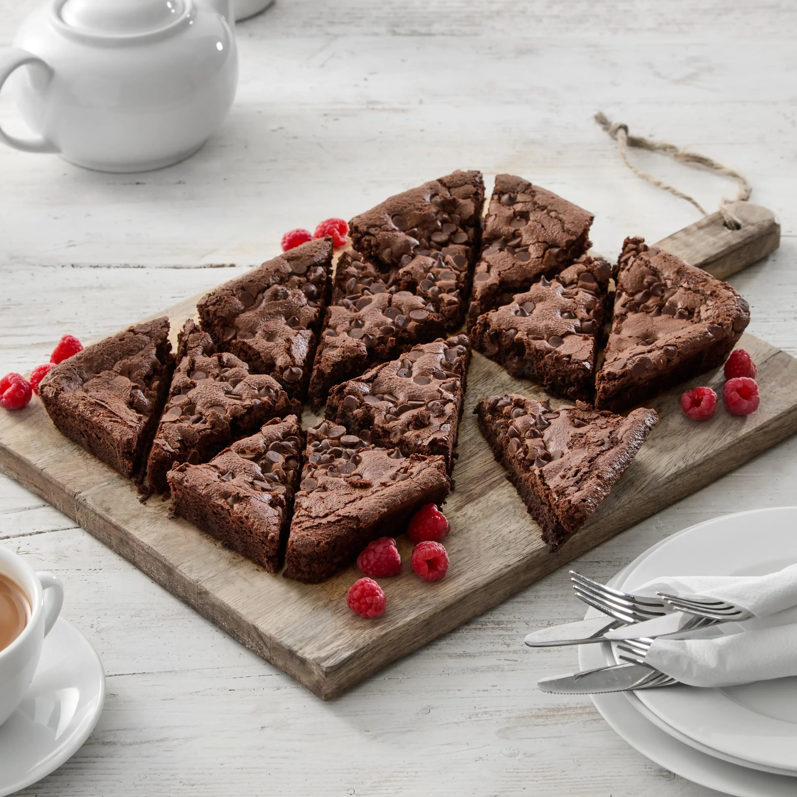 A rich chocolate brownie sponge base with dark chocolate pieces in varying proportions. Pre-portioned into 12 portions in a multi-portion foil, packed 1 foil per outer.