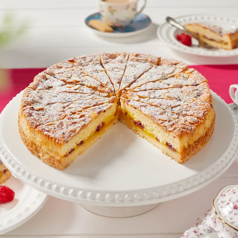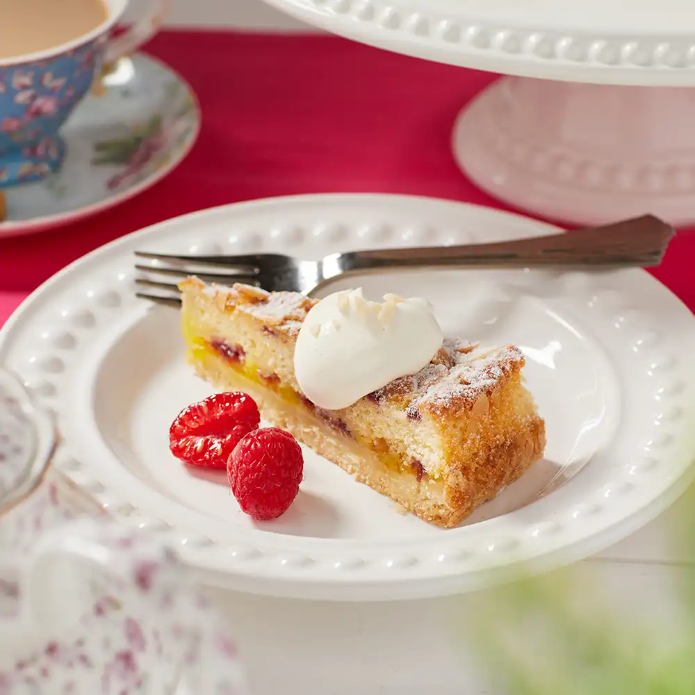 Shortbread base filled with lemon flavour curd and raspberry sauce, topped with almond sponge sprinkled with flaked almonds and sweet snow dust.