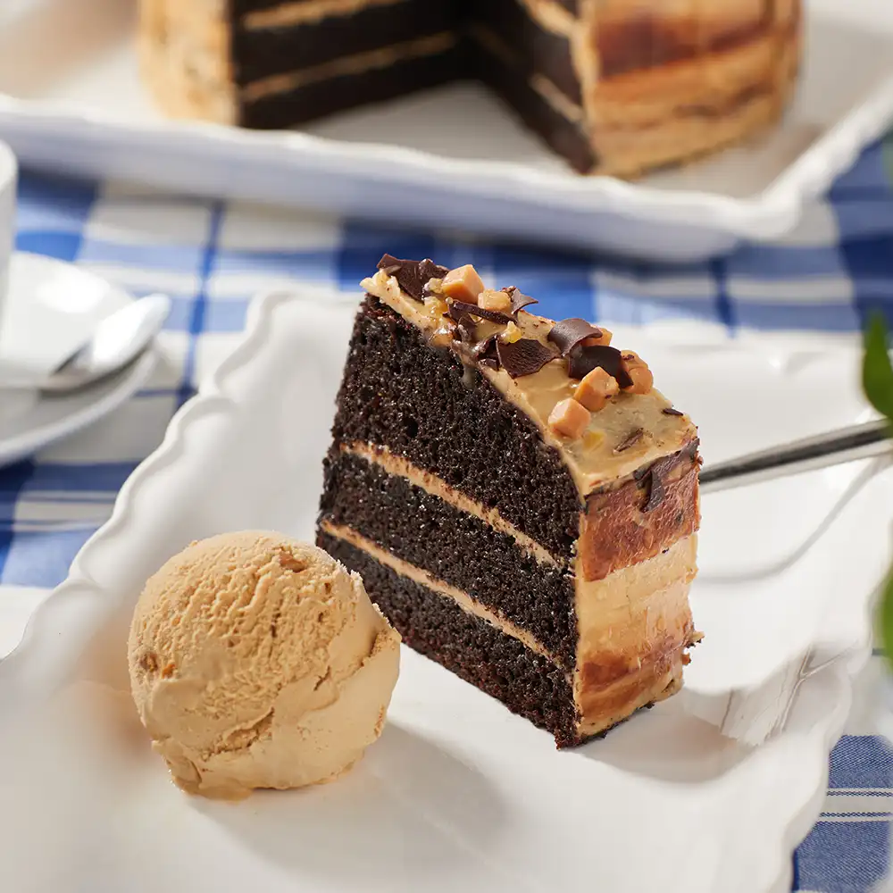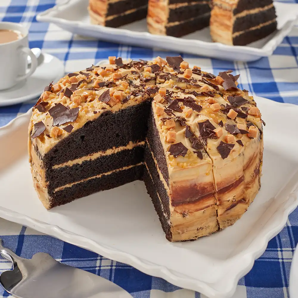 The CHEF Approved Salted Caramel & Chocolate Cake features three chocolate sponges filled and covered with salted caramel buttercream and chocolate ganache, topped with fudge pieces, chocolate shavings, and toffee sauce.