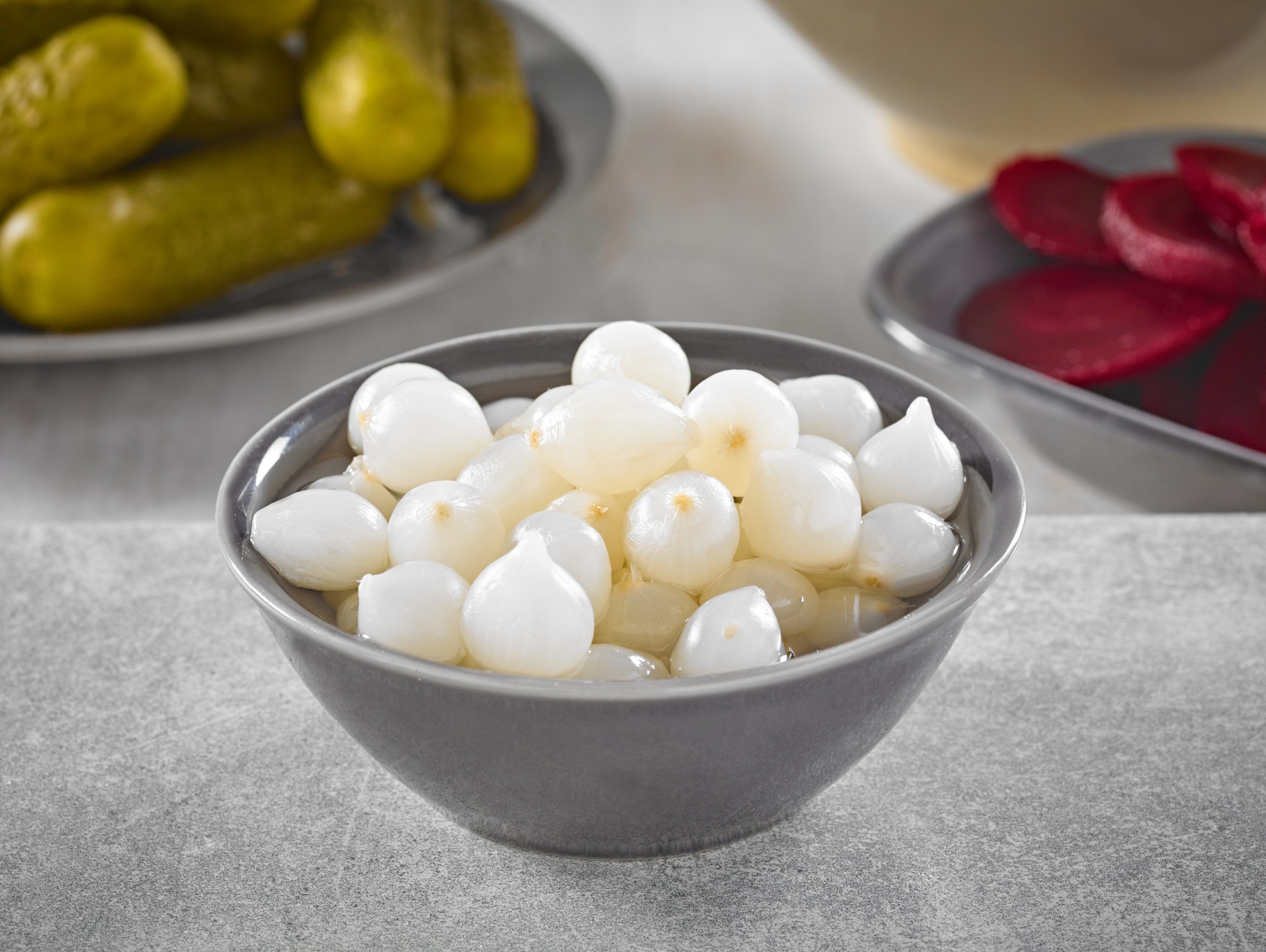 Whole silverskin onions in light, sweet malt vinegar to retain their crunch.
